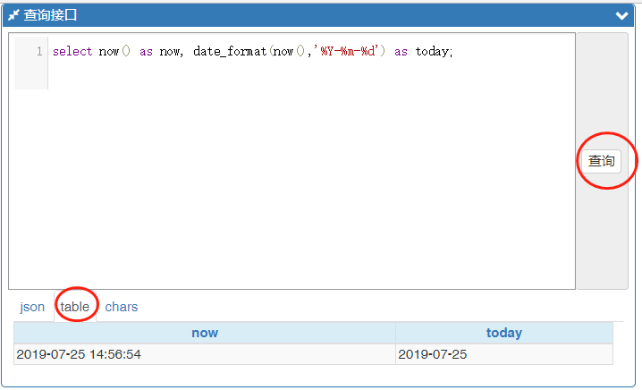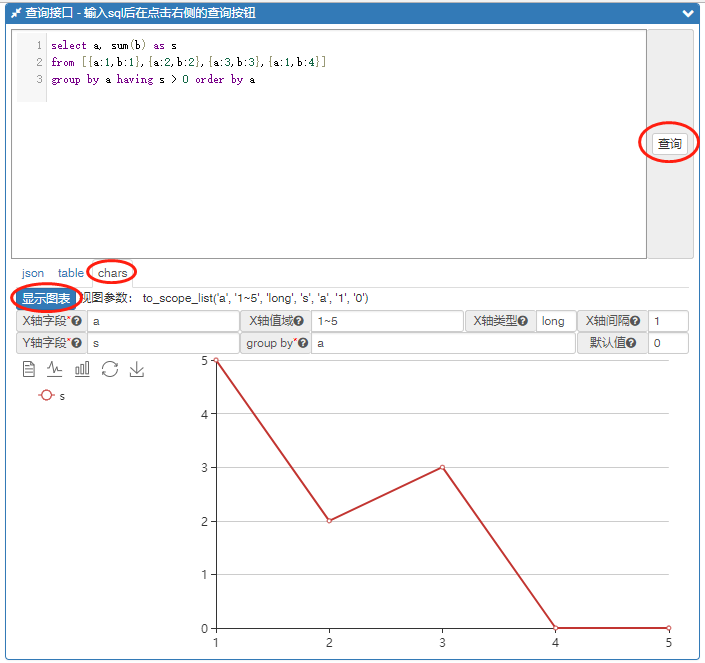 点击右侧查询按钮执行 sql , 点击底部的 chars 可以将返回的 json 数据转换为图表。