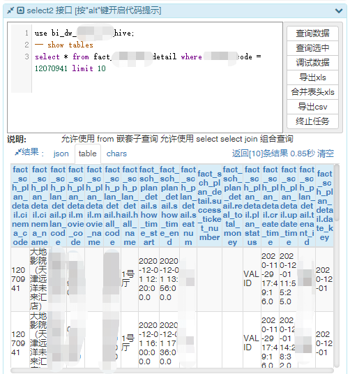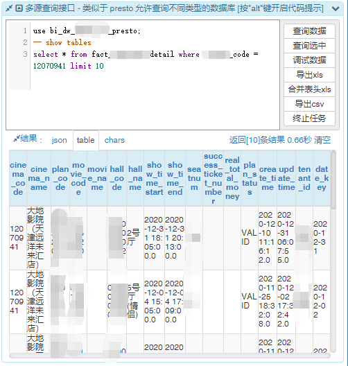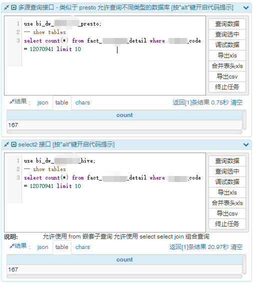 返回格式一致. presto (0.75秒) 比 hive(20.97秒) 快几十倍.
